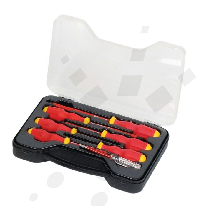 • Set includes 7 pieces (4 slotted tip, 2 Phillips® and a current tester)