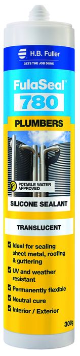 FulaSeal 780 Plumbers Silicone is a neutral cure silicone sealant which does not corrode materials commonly used in roofs and gutters. Tested by the Australian Water Quality Centre, it meets the requirements of AS4020-2005, Products for Use in Contact with Drinking Water. FulaSeal 780 offers a 25 year guarantee against cracking and crumbling when used in standard conditions and applications. It is non-sagging and permanently flexible, offering +/-25% joint movement capability.