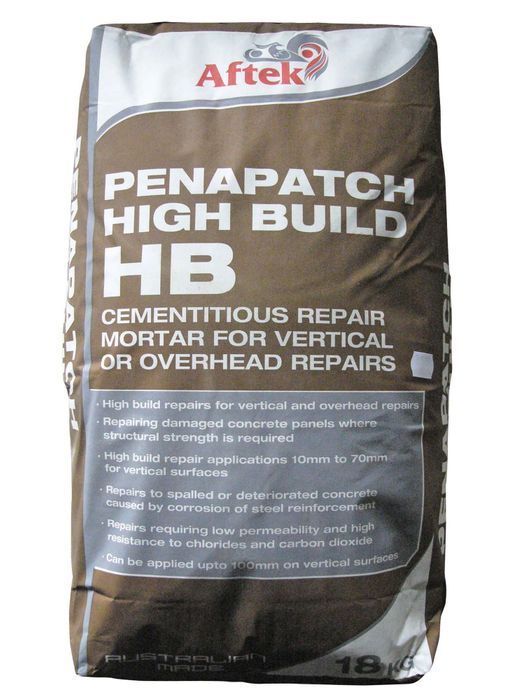 <p>Penapatch HB50 is designed to be used for vertical or horizontal applications. Penapatch HB50 has high, ultimate compressive strength and high abrasion resistance. The specially selected cements and polymers contained in Penapatch HB50 provide a mortar with strong adhesion to concrete and masonry on vertical and horizontal substrates with extremely low shrinkage and relatively low density. Penapatch HB50 requires only the addition of water. </p><p><b>Features:</b></p> <li>High ultimate compressive strength</li><li>High build repairs achievable in a single application</li><li>Low permeability providing protection from chloride attack and carbonation</li><li>High strength and high abrasion resistance</li><li>Excellent workability</li><li>Shrinkage compensated allowing for long term dimensional stability</li><li>Eliminates the need for formwork</li><li>Contains no chlorides</li><li>Can be applied by dry or wet process, achieving high build with exceptional compaction and enhanced performance</li><li>Exceptional bond strength to concrete substrates</li> </p><p><b>Ideal for:</b></p> <li>High build repairs for vertical, overhead and horizontal repairs</li><li>Repairs requiring high compressive strength</li><li>Repairing damaged concrete panels where structural strength is required</li><li>High build repair applications 5mm to 80mm for vertical surfaces<</li><li>May be applied in verticals up to 120mm in small pockets or with the aid of formwork</li><li>Repairs to spalled or deteriorated concrete caused by corrosion of steel reinforcement</li><li>Repairs requiring low permeability and high resistance to chlorides and carbon dioxide</li><li>Can be applied up to 120mm in vertical surfaces</li></p><h2>APPLICATION</h2> <p><b>Surface Preparation:</b></p><p>All surfaces must be free of oil, grease, dust, plaster, paint and any other contamination that will inhibit the bond. Any cracked or weakened surface should be removed and repaired to provide a solid foundation. It is recommended that for large areas a minimum depth of 5mm be prepared to avoid excessive feather edging or skim coating. Break out the repair area to a minimum of 5mm up to the saw cut edge. Scabbing or high-pressure water blasting should be used to remove laitance and provide a mechanical key. If any corroded steel is present remove all loose scale and corrosion/rust deposits. Grit blasting is effective in removing corrosion, and all steel including re-bars should be cleaned to a bright condition. Immediately after cleaning the steel, the steel should be treated with Aftek Zinc Rich Primer. This will stop further oxidation and corrosion. </p><p>Priming is necessary for concrete and masonry, exposed steel and rebar. Refer to the Technical Data Sheet for further information.</p></p> <p><b>Mixing:</b></p><p>Penapatch HB50 is ready to use - simply add the powder to 2.7 – 3 litres of water and mix using a mechanical forced action mixer with a high shear spiral mixing paddle. Mixing normally takes 3-5 minutes.</p> <p><b>Placement:</b></p><p>Thoroughly compact the mortar into the prepared and primed substrate and around the exposed steel reinforcement and re-bars. A smooth surface can be obtained using a steel trowel. Penapatch HB50 can also be applied using a wet application technique. The mortar is pre-mixed with the required dosage of water and then pumped through a delivery hose through a spray gun with a suitable nozzle. Curing should be conducted using a suitable curing compound, such as Curecon A, applied in accordance with the Technical Data Sheet.</p><p><b>Clean Up:</b> </p><p>Wash all tools and equipment with fresh, clean water immediately after use. Penapatch HB50 can only be removed mechanically.</p><b>Storage:</b><p>HB50 has a shelf life of 9 months if stored in the original packaging in a cool dry place.</p><b>Yield:</b><p>One bag will yield 12.9 litres at 2.9 litres water per 20kg bag. 78 bags are required per cubic metre. </p>