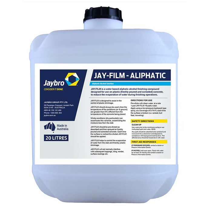 <p><li> JAY-FILM is designed to assist in the control of plastic shrinkage.<li> JAY-FILM should always be used when the temperature of the conditions (air &amp; ground) are greater than 5ºC different from the temperature of the concrete being placed.<li> Windy conditions (dry particularly) can accentuate this variance, accelerating the moisture loss from the slab.<li> JAY-FILM should be pre-diluted as described and then sprayed on freshly poured and screeded concrete. Each time the surface is worked the diluted JAY-FILM should be applied.<li> JAY-FILM helps to control the evaporation of water from the slab and thereby plastic shrinkage.<li> JAY-FILM will not normally interfere with subsequent toppings, tiling, render, surface coatings etc.</p>