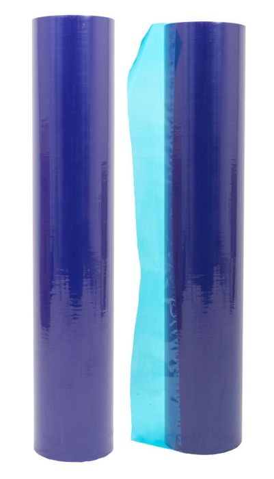 A blue tinted window protection film with a low tack adhesive coating on one side.