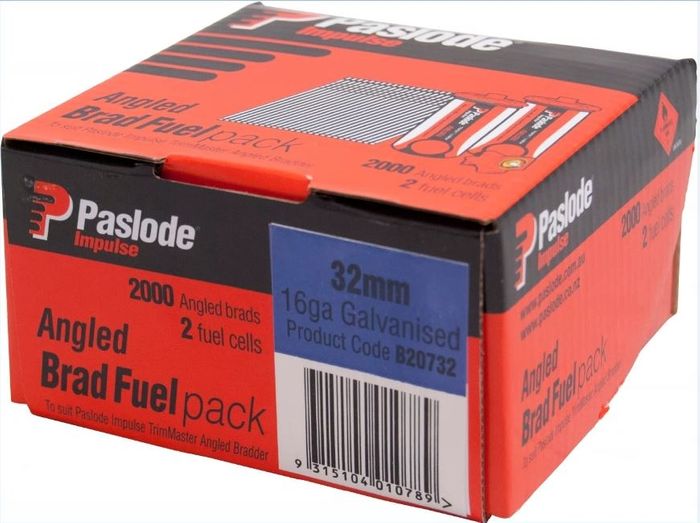 Brad and Fuel Pack - contains 2000 brads and 2 fuel cells Compatible with Impulse Trimmaster IM250A-Li Angled Bradder C Series (16 gauge) 32mm long Lost head 2,000 nails and 2 fuel cells Shank type: Smooth Finish: Electro Galvanized