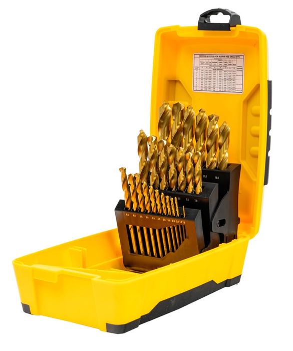This high strength steel drill bit set features all the bits you need for everyday fixing jobs in a convenient carry box. Featuring 25 of the most common general purpose metric bits, this 25 piece twist drill bit set is titanium nitride coated for strength and longevity.