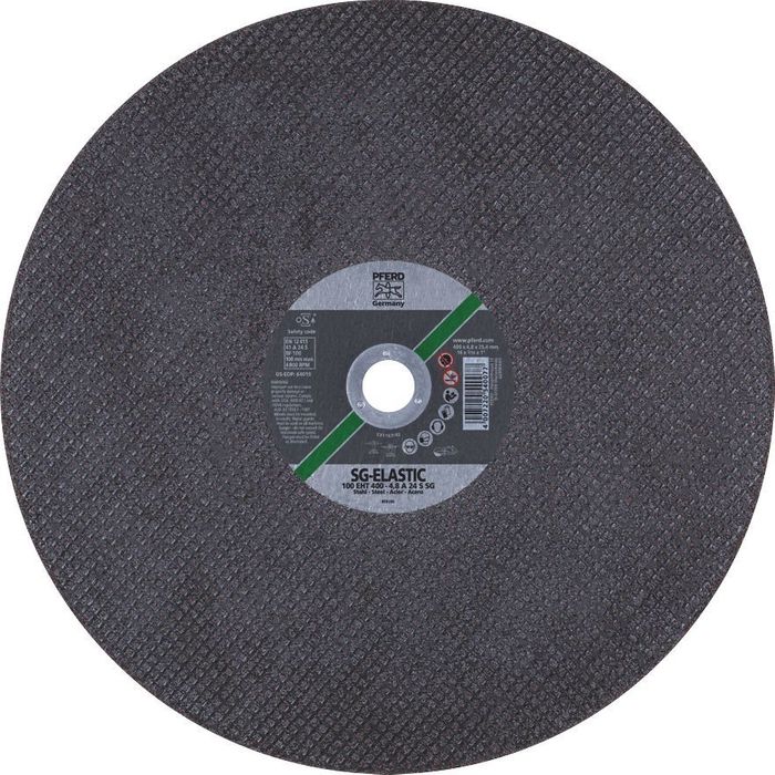 High cutting performance and long tool life for use on hand-held cut-off machine. This Pferd cutting wheel is ideal for steel - a hard special tool with high cutting performance and long tool life. Aluminum oxide A abrasive ensures it is the perfect solution for cutting solid material and profiles in steel and cast iron. Can be used on hand held machines. Suits disc size 350mm, 4.5mm thick, maximum RPM 5500. 25.4mm bore.