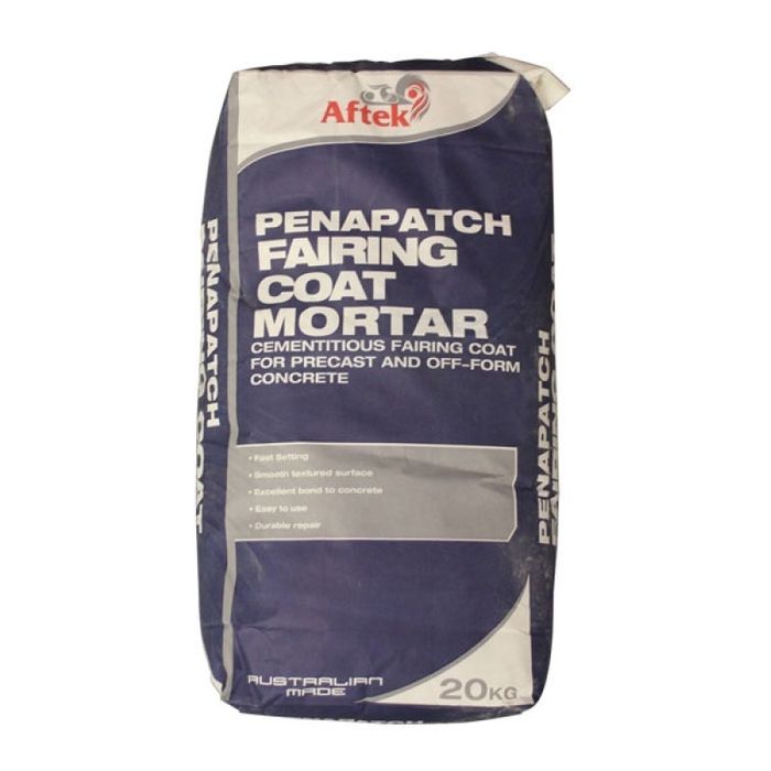 Fairing Coat Grey Mortar is a fine textured, fast setting cementitious mortar formulated for repair of damaged concrete where only a thin layer is required. The specially selected cement and polymers produce a fast setting mortar with exceptional adhesion to concrete and masonry materials with negligible shrinkage. Aftek Fairing Coat Mortar cures to a smooth surface that does not reflect through subsequently applied architectural coatings. It sets quickly and provides an excellent bond to concrete.