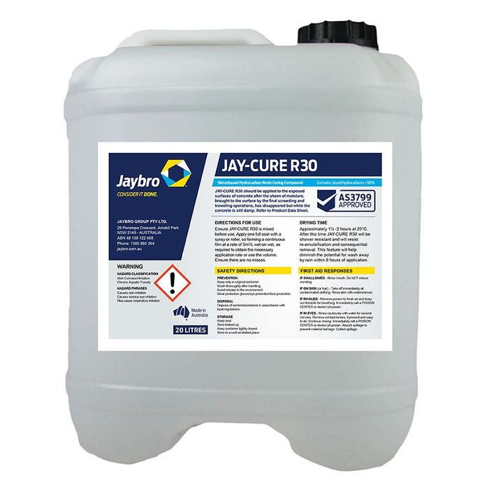 Jay-Cure R-30 is a liquid applied curing compound which consists of a processed blend of petroleum and resin based hydrocarbons. When applied at the recommended application rate Jay-Cure R-30 minimizes moisture loss in freshly laid concrete thus improving the curing of the concrete providing increased strength and durability and improved resistance to surface dusting.