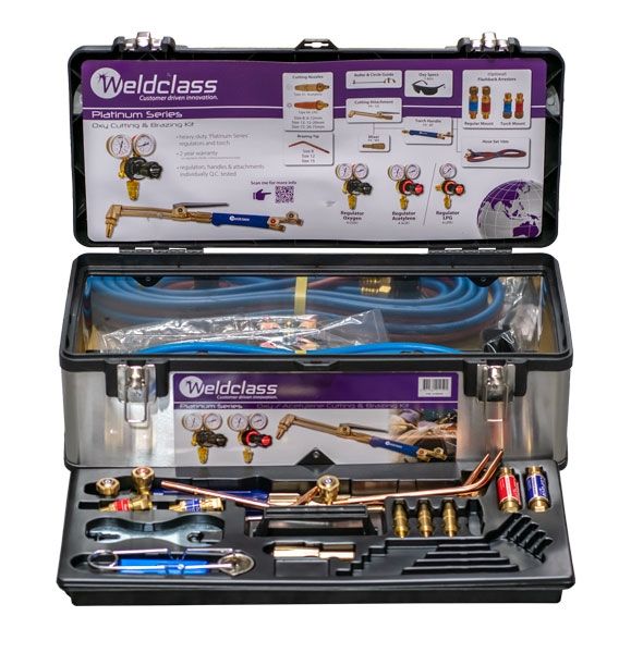 Heavy duty Weldclass Platinum Series oxy acetylene kit. Supplied with flashback arrestors and a bonus combination circle/roller guide, this kit is high quality and comes complete in a robust stainless steel tool box with plenty of space.