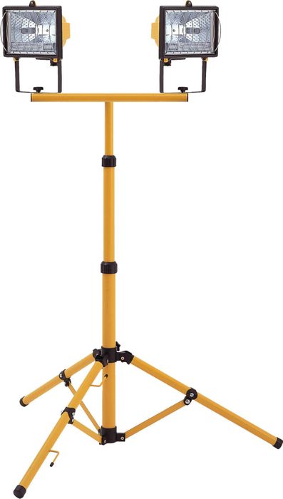 Features twin 500W halogen floodlights on an adjustable aluminium tripod. Great for night work and anywhere extra light is required on site. The halogen lamps give excellent visibility and are ideal for indoor or outdoor use. The waterproof lights feature a safety grill and tempered glass face. Lamps can be individually positioned and the main stem can be adjusted up to 1.8 metres in height. Ideal for contractors, builders and tradespeople, this twin work light features highly visible yellow coating and a sturdy 3 point base to resist toppling.