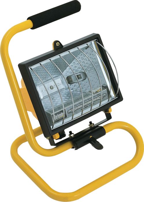 This waterproof portable work light comes with a safety grille to guard against knocks and accidental contact. The strong tubular steel frame provides a stable base and allows the work light to be positioned exactly where you need it. The soft touch handle is cushioned and the the weatherproof housing is positionable allowing you to direct light on the work area. Supplied with a 500W halogen globe. Safety yellow powdercoat ensures good visibility on site.