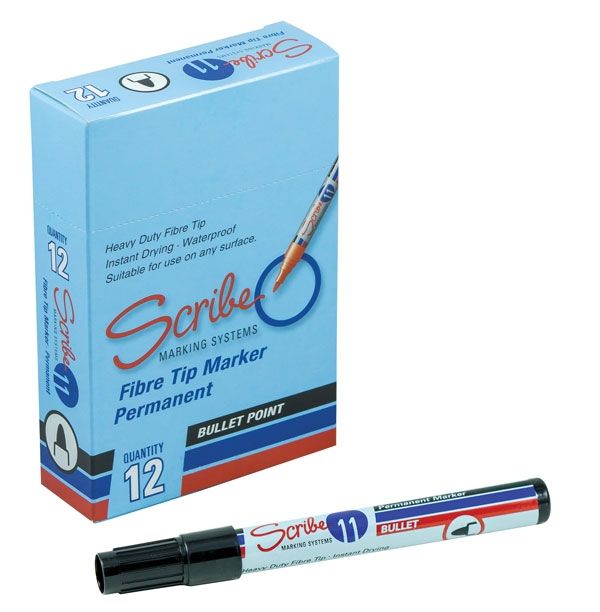 Black bullet point marking pens. A quality waterproof and fade resistant permanent marker pen that is recommended for use on job sites or around the office. Supplied in a handy box of 12 textures.