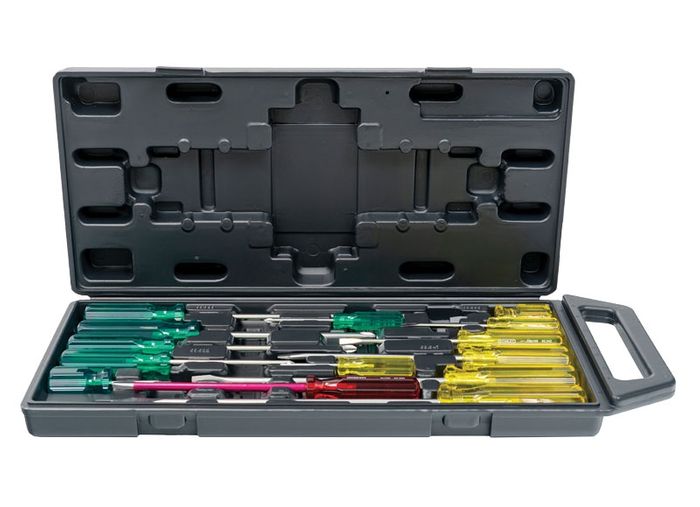This 14 piece screwdriver set has industrial strength acetate handles. Made from premium grade nickel chrome vanadium steel. Feature cellulose acetate handles for impact resistance. These precision screwdrivers have ground and hardened tips, resulting in better usability and longer working life. The magnetised tips make working with smaller screw a breeze.