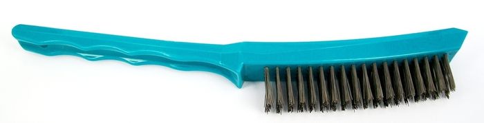 Heavy-duty wire brush with a plastic handle and four rows of bristles made from steel wire.